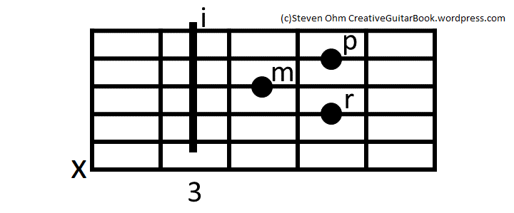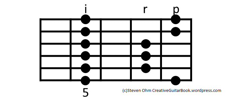 This diagram shows how to play an A minor (C Major) pentatonic scale. Notice that the 5th fret is not barred; meaning the notes are played separately. Fingering can be flexible due to the hand size but the basic fingering is shown on the diagram.